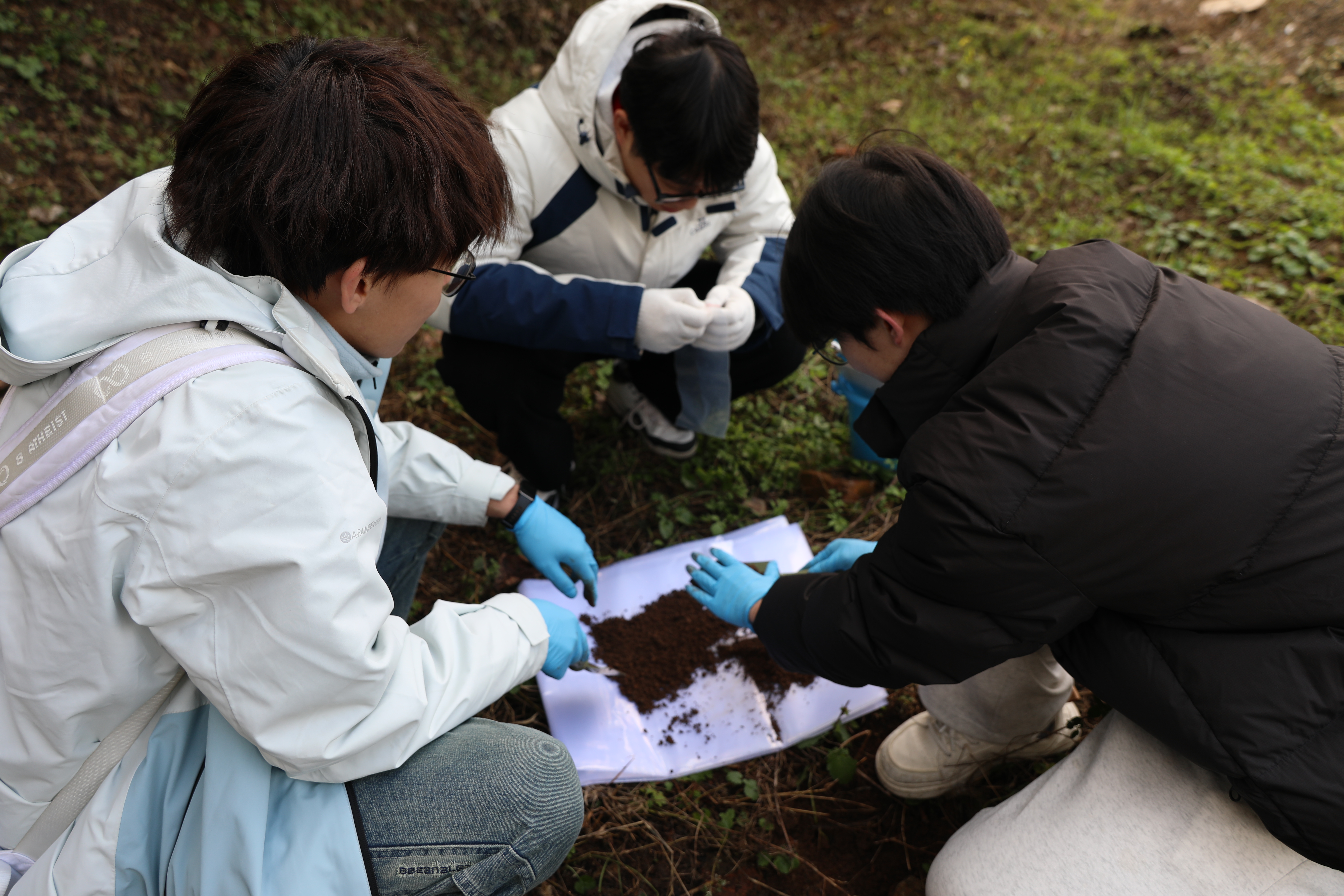 实地采样,为土地“把脉”。在“土壤采集”环节,支部成员走入下庄村南山绿化造林区与板栗种植区,运用专业知识系统采集不同类型土壤样本,并详细记录了各采样点的坐标位置、植被覆盖情况及土地利用现状等信息。采集的土壤样本后续将在实验室进行pH值、有机质含量及重金属含量等多项指标的检测,检测结果将为下庄村林地养护与农业生产提供科学依据,助力乡村生态环境保护与农业可持续发展。