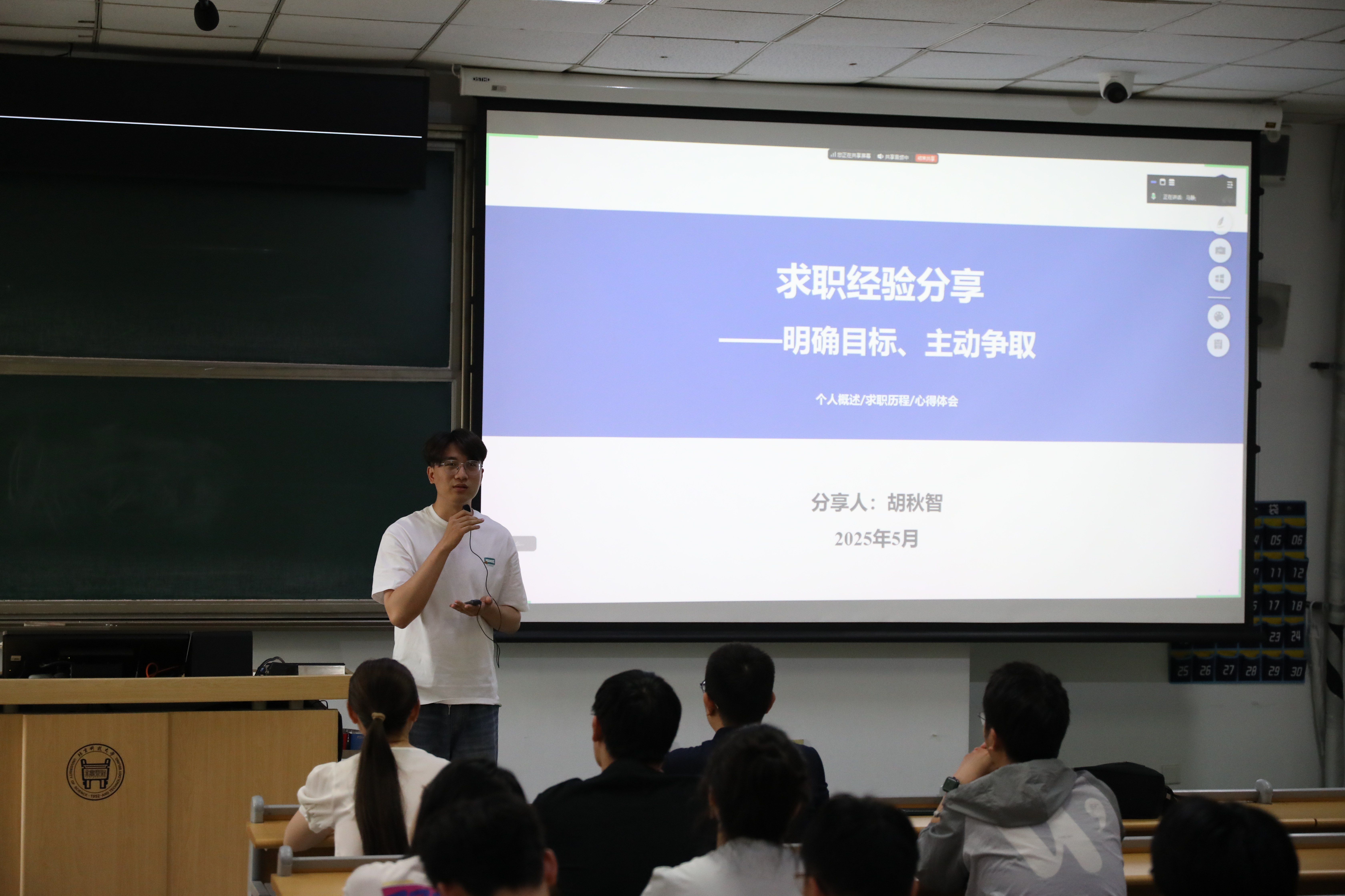 随后,胡秋智结合自身经历,从求职节奏、简历制作、求职信息获取等方面分享了个人经验。他通过讲述自己求职心态、策略的转变,建议同学们在求职过程中要勇于尝试,积极沟通,主动跟进。同时,他通过对“热设计工程师-手机”岗位招聘信息的分析,阐释了简历“人岗匹配”原则的关键作用。