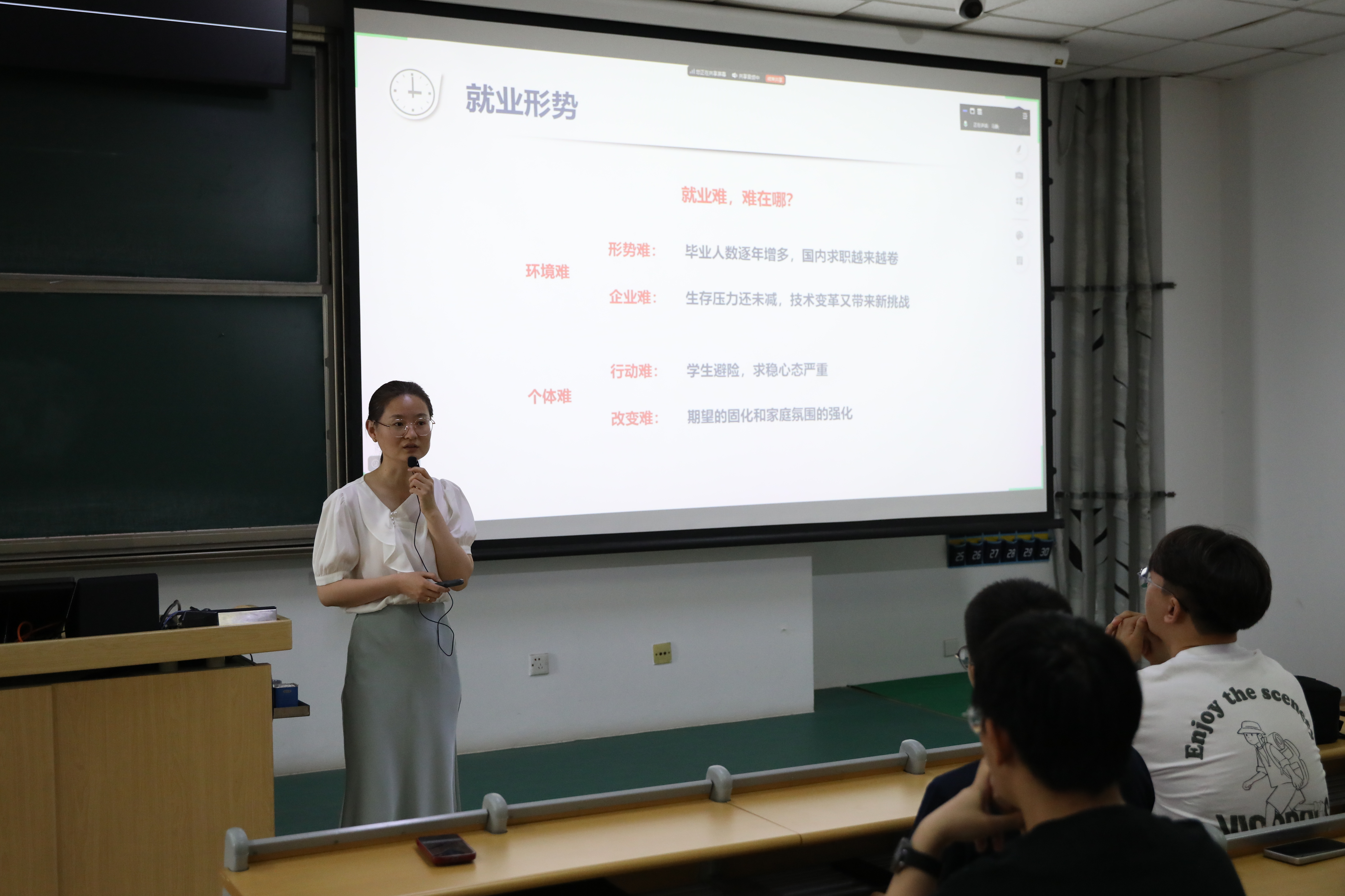 动员会上,胡琳茹就近几年毕业生就业形势、就业市场变化趋势、毕业生呈现的典型问题以及国家对毕业生就业的扶持政策等内容进行了详细解读。她结合具体就业数据和案例,分析了能源与环境领域的就业前景,并鼓励同学们积极应对挑战、把握发展机遇,结合个人兴趣与专业优势精准定位就业方向。同时,她还在如何制定个人职业规划、提升就业竞争力等方面给出了具体建议,并着重强调了积极参与实习、做好时间规划的重要性。