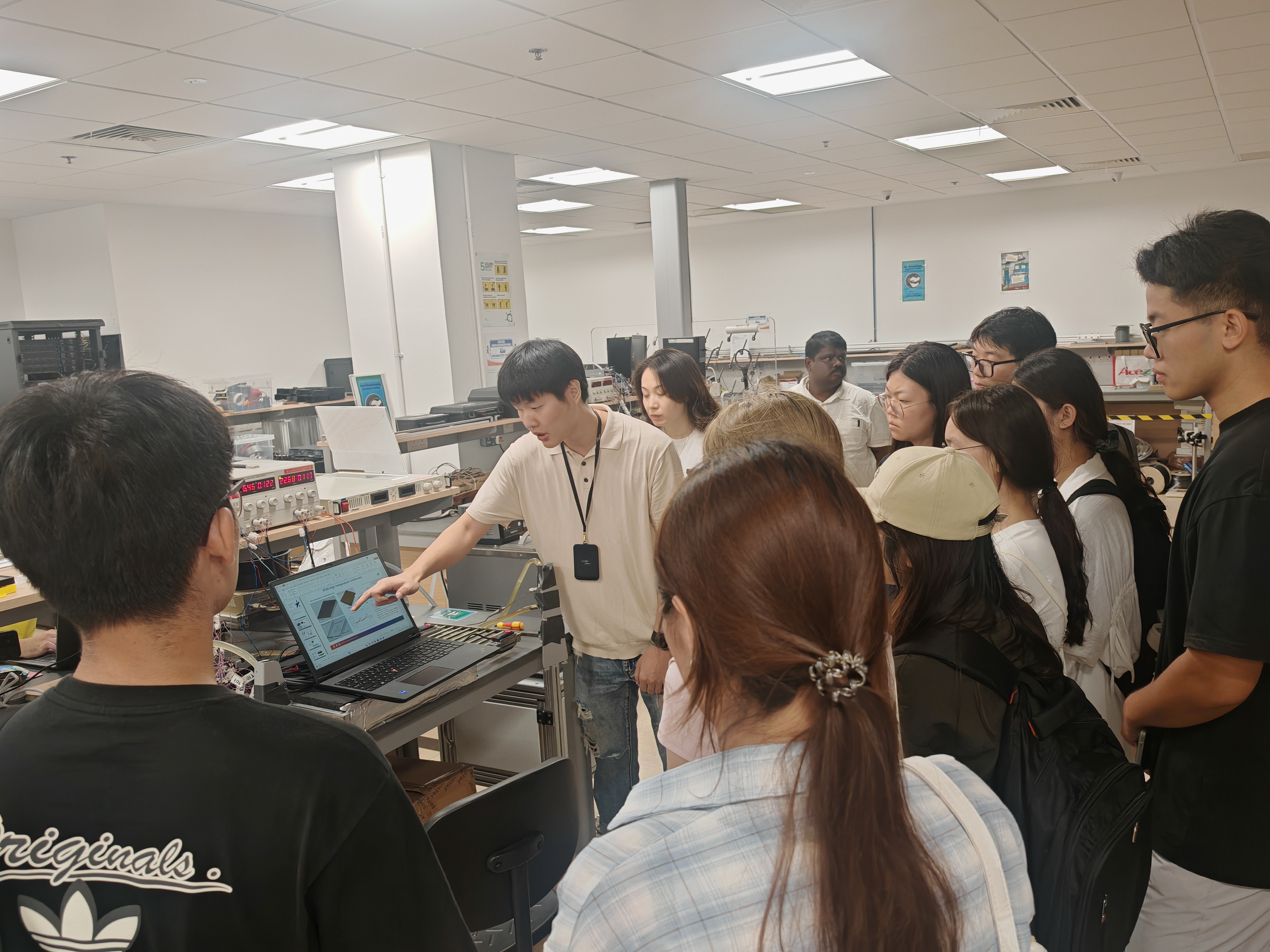 接着,访学团一行来到新加坡国立大学可持续热带数据中心试验基地(Sustainable Tropical Data Center Testbed, STDCT)。为访学团队系统介绍了该平台的成立背景、研究使命及核心研究方向,深入讲解了直接芯片混合冷却、浸入式液冷等先进散热方案,以及AI驱动的数字孪生系统、可再生能源集成与智慧能源管理等前沿课题的研究进展与实际应用。陈怡馨同学表示,通过交流学习,她不仅对绿色数据中心的前沿技术形成了直观认识,也深切感受到新加坡在热带数据中心能效优化与气候适应性研究中的国际领先地位。