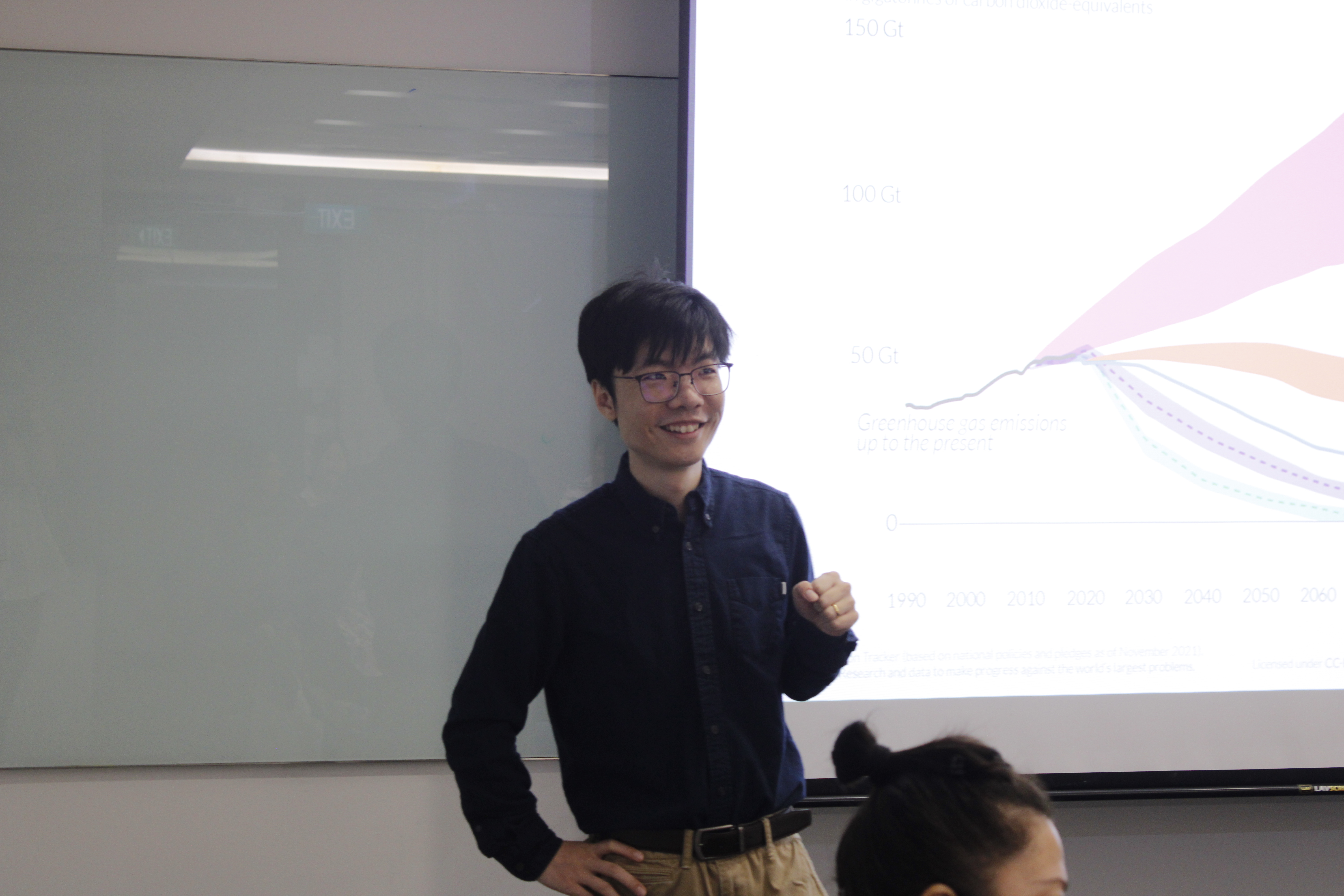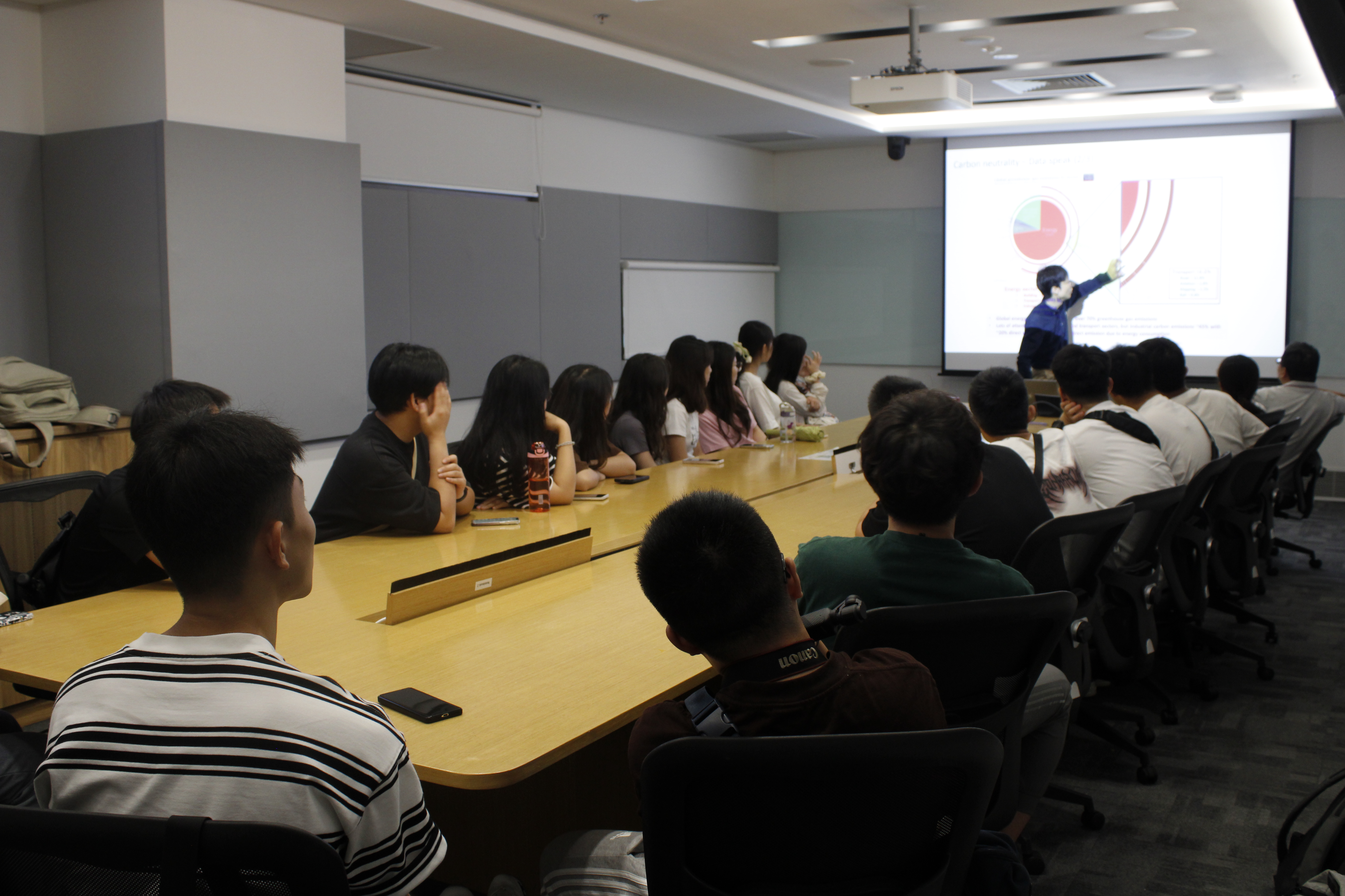 活动当天,南洋理工大学能源研究院的杨立中教授首先为访学团详细介绍了研究院的研究方向和前沿成果。杨教授通过展示公式“CO₂ = D × E × F - C”,简明阐述了能源相关的碳排放计算方法,其中D代表能源需求(Demand),E代表单位需求的能源消耗(Energy per demand),F代表碳排放因子(Factors of carbon emission),C则代表碳捕获量(Carbon capture)。该公式强调了通过降低能源需求、提高能源效率、选择低碳能源以及加强碳捕获技术,可以有效减少碳排放,实现可持续发展的目标。