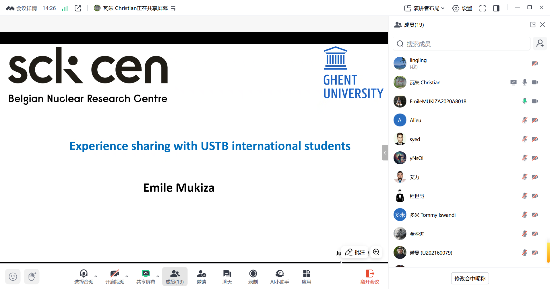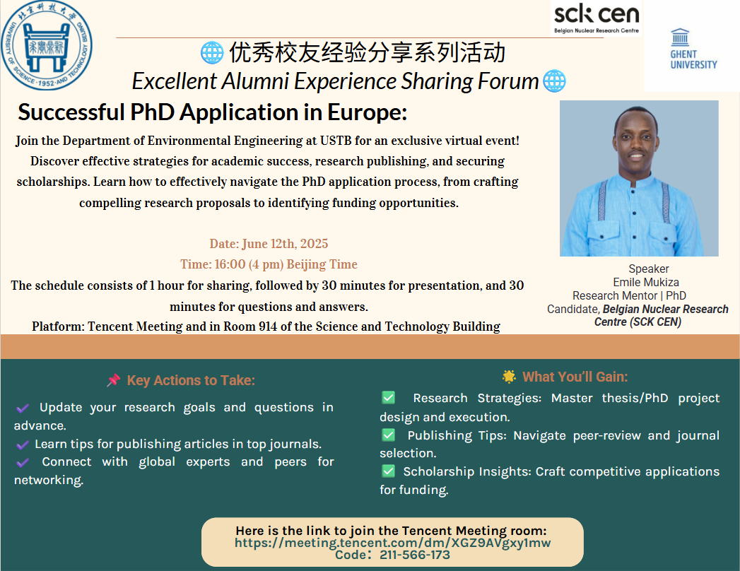 本次分享会邀请了2019届来自卢旺达的来华硕士职工Emile Mukiza(中文名:米勒,硕士期间导师:张玲玲教授,现就读于比利时核研究中心Belgian nuclear research center)重磅回归,为来华留学们带来关于博士申请策略与博士阶段学习的深度解读与实用经验。分享会参与人员不仅有环境科学与工程系在读硕士和本科生,还有来自资安学院和经管学院的来华职工。
